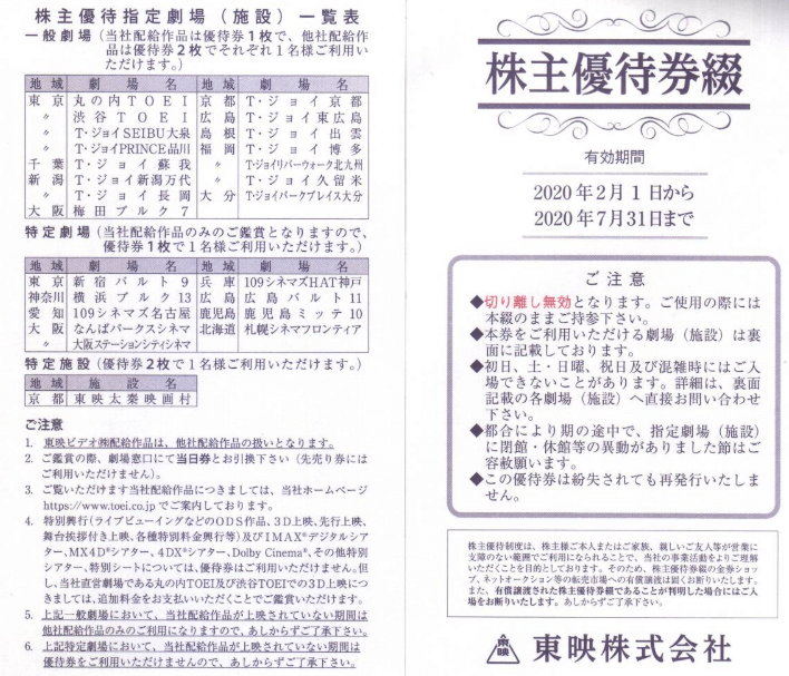 | 特典 | ・東映配給作品は優待券1枚で、他社配給作品は優待券2枚で1名分利用 ・東映太秦映画村は2枚で1名分 |