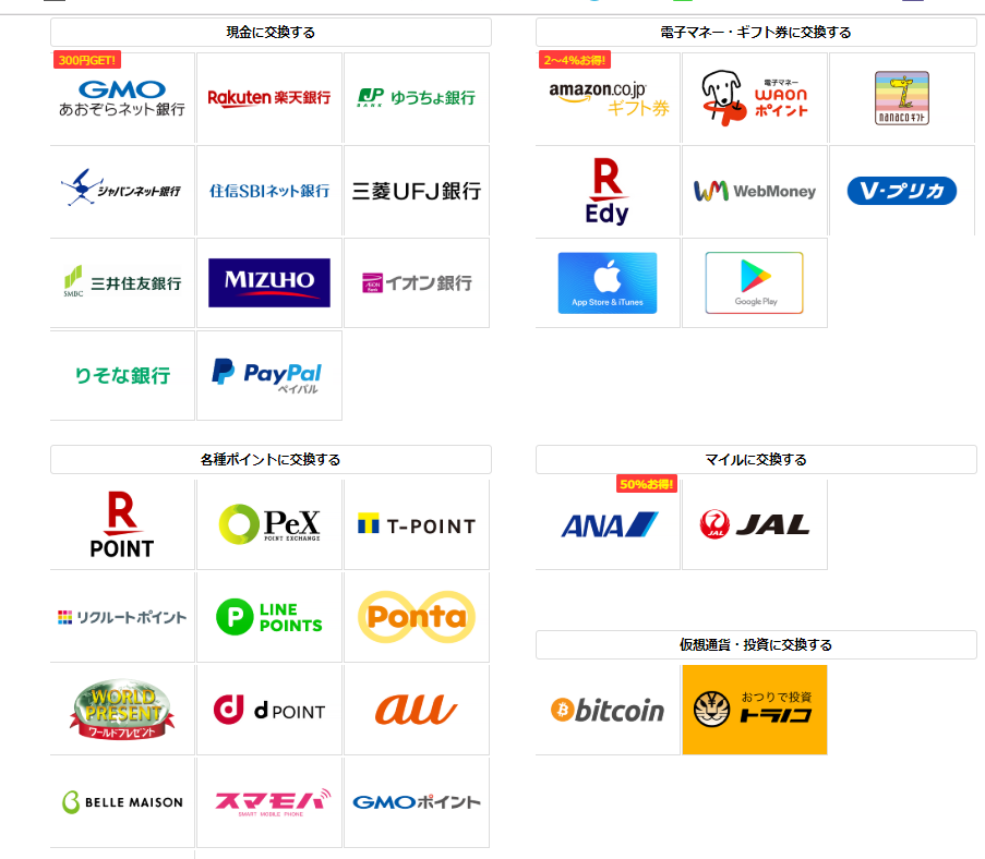 | ポイント交換 | 現金、電子マネー、ポイント、ギフト券 |